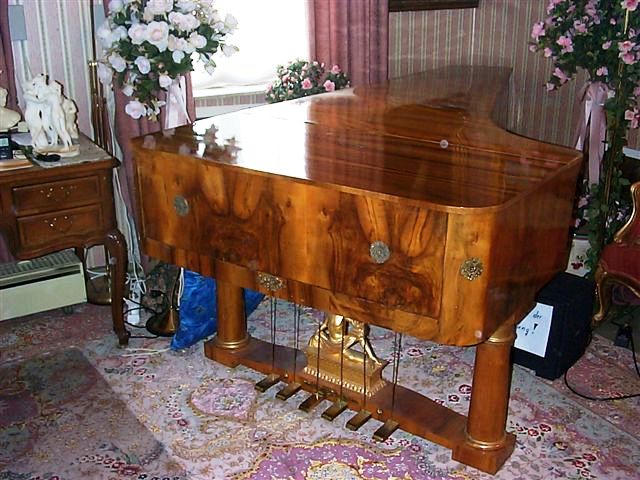 - Fußgestell 3 Säulenfüße (Nussbaum, nach oben leicht konisch verjüngt), mit vergoldeten Zierringen; unter Füßen jeweils quadratischer Klotz; Verbindungsbrett zwischen Vorderfüßen zur Befestigung von sechs Pedalen, diese auf Zug (mittels Verbindungsdraht) wirkend; auf Verbindungsbrett vergoldeter sitzender Apoll mit Lyra.