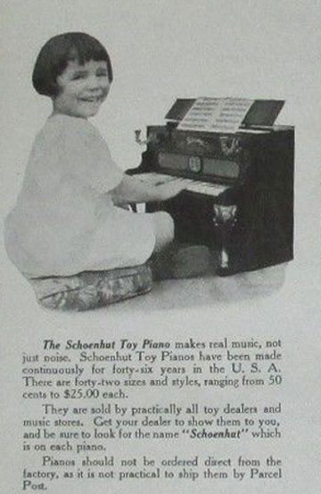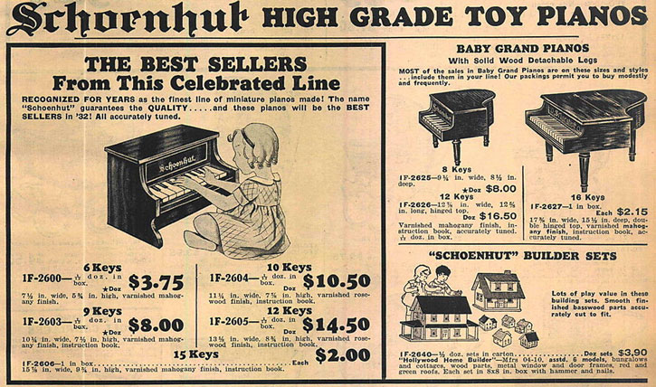 Schoenhut-Anzeige 1932 - mit 6, 9, 10, 12 und 16 Tasten, allesamt akkurat gestimmt!