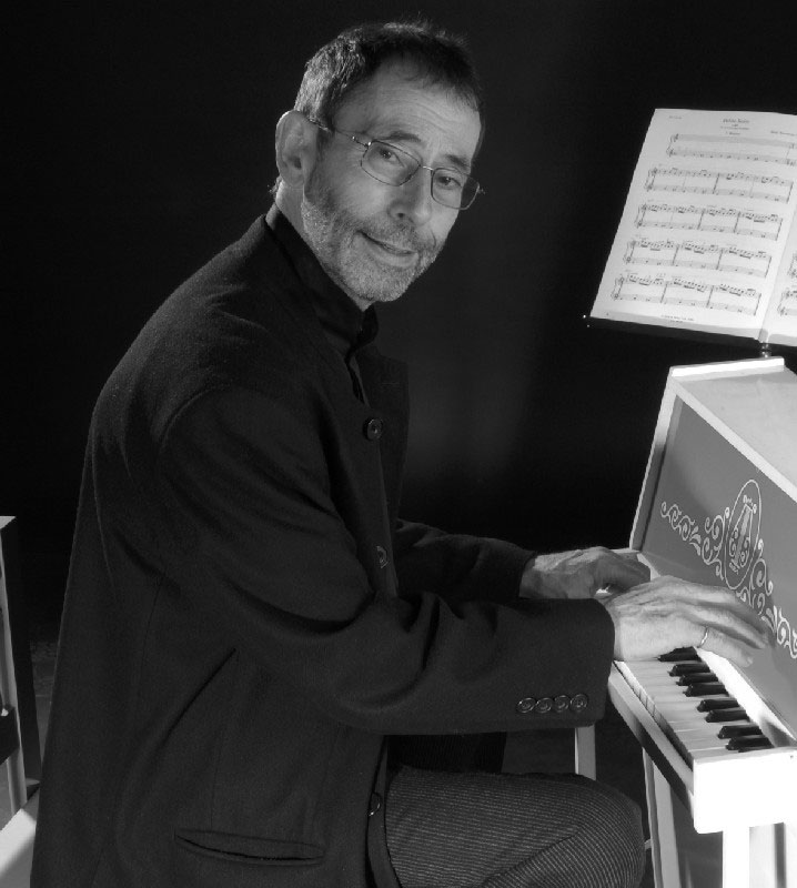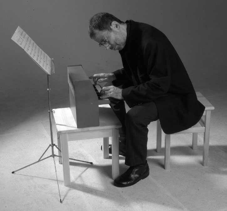 Bernd Wiesemann (1938-2015) am ToyPiano "Musikus Studio" (Instrument I093)- auf dem Notenpult aufgeschlagen "I. Walzer" aus seiner 1987 komponierten "Petite Suite für ToyPiano". Foto: Archiv Cybele Records, Düsseldorf.