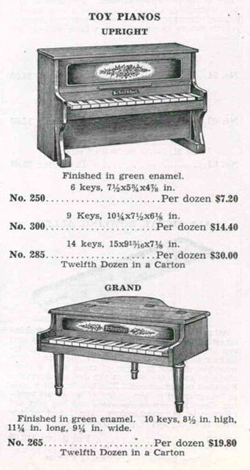 links: Schoenhut-Anzeige 1934 - mit 6, 9, 10, 14 Tasten, reduziertes Programm nach Weltwirtschaftskrise? rechts: Schoenhut-Anzeige von 1918 . Der Text spricht von 42 verschiedenen lieferbaren Größen und Ausführungen (jeweils Ausschnitte der Anzeigen: nur der ToyPiano-Teil ist reproduziert).